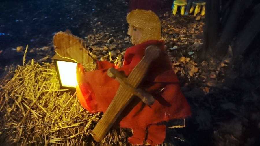 Wir haben mit St. Martin und unseren selbst gebastelten Latenen (ein paar hatten sogar die Fledermauslaternen dabei) einen Martinsumzug gemacht und sind hinter Martin und seinem Pferd her gelaufen und haben alle Martinslieder gesungen, die wir geübt hatten. Bis zum Martinsfeuer sind wir gelaufen und dort hat uns Anja die Martinslegende erzählt und St. Martin mit dem Pferd und der Bettler haben die Legende nachgespielt, das war wie in kleines Theatherstück.